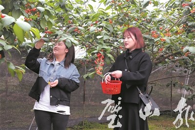 進(jìn)入4月,來(lái)鳳街道鹿河村家中果園的溫室大棚櫻桃陸續(xù)成熟,南早紅、紅妃等多個(gè)品種的櫻桃如一串串紅色珍珠,掩映在翠綠的枝葉間,格外誘人,吸引了不少來(lái)自璧山城區(qū)以及重慶主城的游客觀光、采摘。