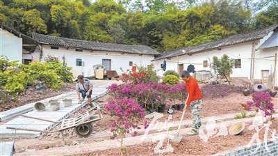 4月28日,在青杠街道沙坡村,工人正在美化房屋周邊環境,打造文明院落。據悉,結合我區創建全國文明城區工作,青杠街道迅速行動起來,對居民房屋進行了粉刷改造,在院落周圍栽種花草樹木,并對道路進行了硬化,切實改善了農村人居環境。