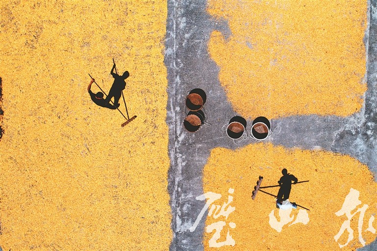 8月10日,大路街道團壩村,農民在院壩晾曬玉米。立秋后,我區夏熟作物陸續進入收獲期,農民抓住晴好天氣,搶收玉米、高粱、豆子、花生、辣椒等農作物。