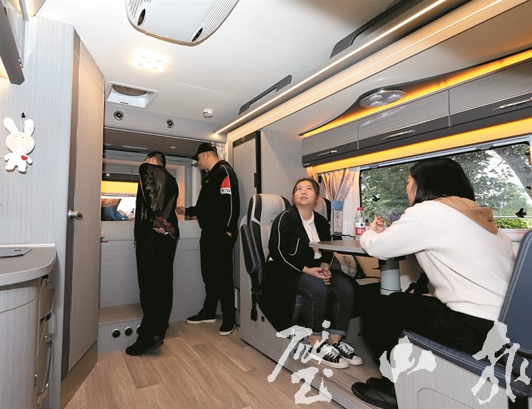 走進房車內部,總體設計簡潔大方,房間、客廳、衛生間、廚房等各個功能區劃分清晰明了,空調、冰箱、電視、床等家具家電一應俱全,部分房車甚至還專門配備了卡拉OK等娛樂設施。下房車可看世界,上房車即有專屬小天地,觀展市民不時驚嘆,紛紛拍照留戀。
