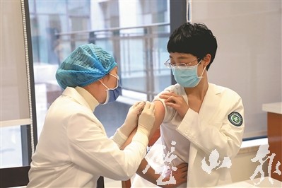 1月13日,區人民醫院,醫務人員正在為接種人員注射新冠疫苗。據了解,本次新冠疫苗接種主要針對一線醫務人員,進口冷鏈、口岸檢疫工作人員等重點人群。目前,全區接種工作正有序推進中,重點人群累計已接種1632人。(記者  尹秀秀 攝)