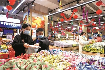 1月26日,市民在永輝超市(時(shí)代商都店)內(nèi)選購(gòu)糖果。春節(jié)將至,年味愈濃。轄區(qū)內(nèi)各大超市紛紛將干果、糖果等年貨擺放在顯眼位置方便顧客挑選,一些包裝上帶有“福”“牛年大吉”“新年發(fā)財(cái)”等圖案或者文字的糖果更是受到市民青睞。(記者 王鋒 實(shí)習(xí)生 黃欣林 攝)