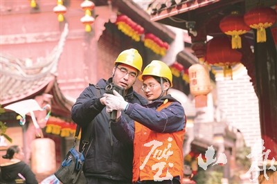 2月17日,璧山供電公司員工在秀湖非遺小鎮檢查商戶用電安全。