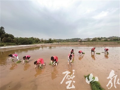 “分秧要均勻,秧苗之間要保持一定間距……”在護普村成片的高標準農田里,擅長農作的老黨員劉洪仁、人大代表尹道富仔細講解著秧苗的種植步驟,志愿者躍躍欲試,紛紛挽起衣袖、卷起褲腿,干勁十足“扎”進水田,大家分工明確、協同合作,分秧、送秧、插秧,不一會兒,一塊兩畝多的農田便換上“綠裝”。