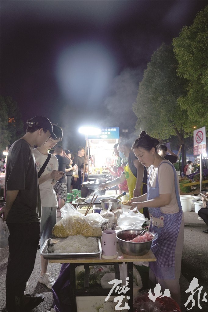 如果說后備箱集市讓不少人輕松實現了“老板夢”,那“地攤”這個老詞也在后疫情時代煥發出新的活力。華燈初上,位于璧泉街道夢圓廣場上的一處夜市上,閃爍的霓虹燈中人流涌動,伴隨著升騰的煙火和小販們的叫賣聲,構成了城市獨特的煙火氣息。