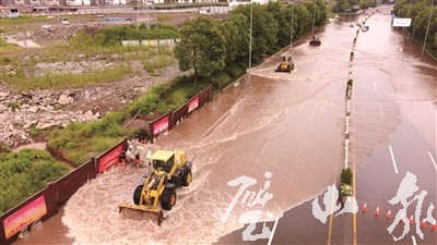 7月25日,區應急局安排鏟車對黛山大道積水路段協助排水。