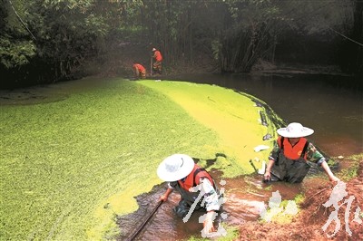 正興鎮衛寺村,管護人員正在清理浮萍。
